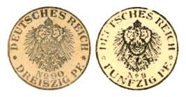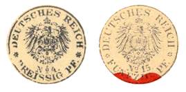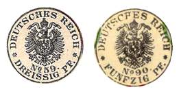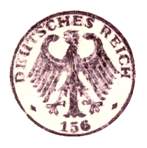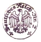 1896 - 1902Nach seiner Amtsübernahme 1888 verfügte Kaiser Wilhelm II., dass in Zukunft der von ihm eigenhändig entworfene große Reichsadler mit kleinerem Schild geführt werden solle. Ab 1890 wurde dies bei Münzen, später auch bei neu angefertigten Steuerstempeln umgesetzt |