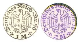 1919 - 1923Mit dem Ende des Kaiserreiches wurden am 1.11.1919 in der Weimarer Republik Steuerstempel mit neuem Reichsadler und neuen Gebühren eingeführt: Für Spiele bis 24 Blatt waren 1 M(ark), bis 48 Blatt 2 M und darüber 3 M zu entrichten. Die Durchmesser der neuen Stempel betrugen 22 mm. |