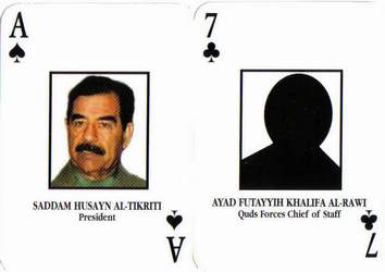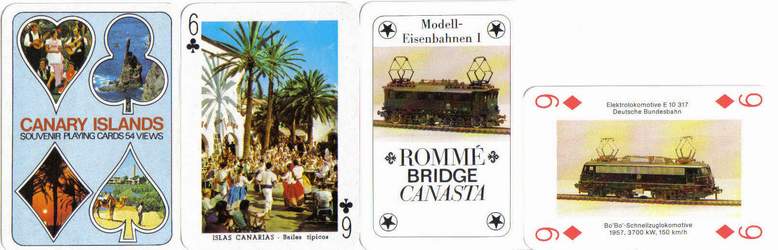Normally only the index (suit symbol and rank) on the picture side reminds that these are playing cards at all. Without this identification we could talk about trading cards. On all cards - depending on the game 32, 36, 40, 52, 55 or another number - is a photograph, a drawing, or any other image. The difference to the non standard cards is that the single pictures have nothing to do with the rank of the card. In the non standard decks the king is a king even if it is Mickey Mouse and the pips mostly remain unchanged. The most common motives are places, as souvenirs, just to remember and these cards are usually sold to tourists. The contents can be practically anything like art of a museum, characters from movies or nude beauties. The most famous example of souvenir cards is the set "55 Most Wanted", that the American army distributed to their soldiers in Iraq to recognise the wanted persons of the defeated regime.