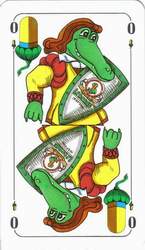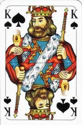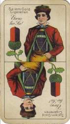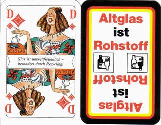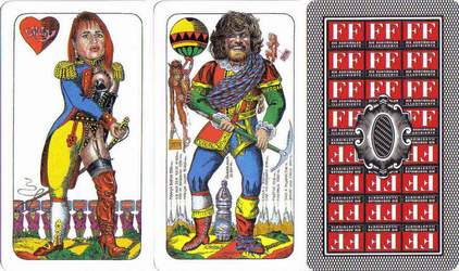Another way is in slightly changing the original pictures that they include a message. For example the sword or other objects can be replaced by something the court cards advertise for. A step further is when a company completely redesigns the pattern. Here there a two groups. First the card pattern still resembles an original and second it was entirely designed from scratch. Especially these types of games can be most interesting for collectors. They are quite unusual and have a limited edition. Often they are quite artistic and appealing. Rather rare are commercial messages directly on the card pattern but without changing it. White spaces on the from side are used to add a text.