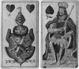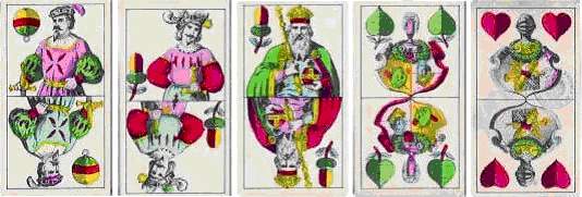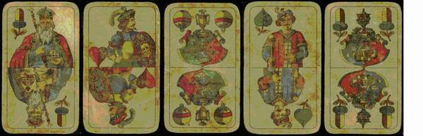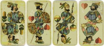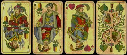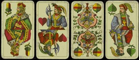 About its origin there is still a mystery. It was made in Ulm, Bamberg (but with different patterns on Daus) and later in Darmstadt. The first decks appeared as single figure cards around 1820. Double figure cards are known since 1860. They disappeared after the World War I. around 1925.