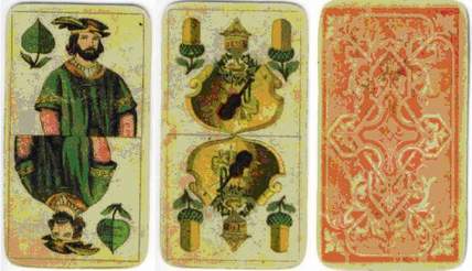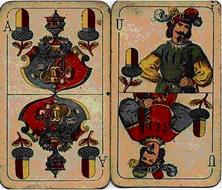 The figures of Ober and Unter wear clothing in style of renaissance and remind of mercenary cards. Important characteristics are the Daus pattern and the fact that both halves of cards are colored different.
