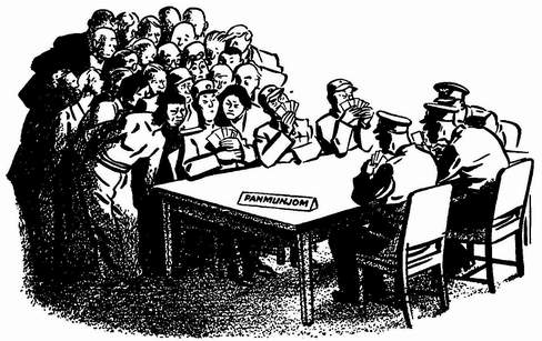 A delegation from China led by General Wu travelled to the United Nations to explain that Chinese in Korea were not troops but "volunteers". There was doubt as to whether, not being "recognised", he should be invited to sit or to stand, and the party broke up when he was asked to admit that China was an "aggressor". At last, on the proposal of Soviet delegate Malik, peace talks on the war in Korea began at Panmunjom.