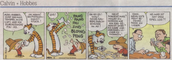 Okay, Hobbes, throw the deck, and I will punch the ace of spade. - Oh boy! A gun trick!