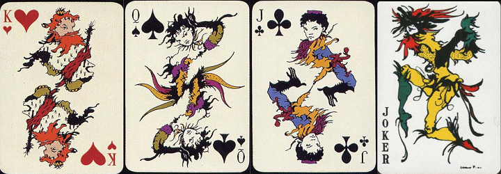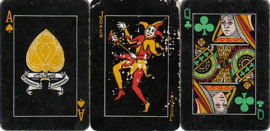 Description: Letterpress, black bacground. Each suit in a different colour: spade = yellow, heart = red, diamond = white, club = green. Interesting Joker included