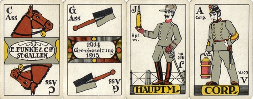 Description: Seltene Militärspielkarten aus der Schweiz. Die 4 Farbzeichen wiederspiegeln die Waffengattungen Kavallerie, Artillerie, Infanterie und Genie; die Figurenkarten Hauptmann, Oberleutnant und Korporal.