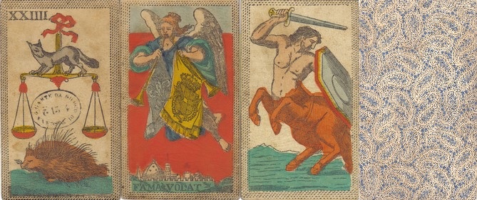 Year: c. 1820, tax stamp reads "Carte da giuoco di Toscana, S (Soldi) 13.4" (see first card on the scan)