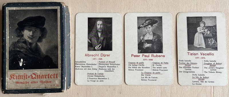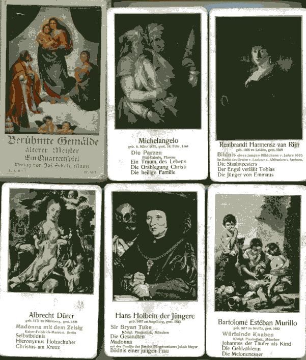 Description: Auf allen Karten schwarz-weiß Fotografien von berühmten Gemälden alter Meister: Dürer, Holbein d.J., Murillo, Rembrandt, Michelangelo, Tizian, Raffael, da Vinci, Hals d.Ä., van Dyck, Rubens, Velasquez