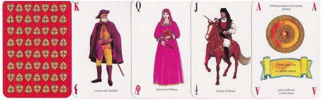 Description: Description: due mazzi nella stessa confezione, uno a dorso rosso ed uno a dorso blu (ancora sigillato). Come semi sono stati utilizzati oggetti tipici della Sardegna; sugli Assi ci sono proverbi sardi, con traduzione in italiano, e le figure rappresentano personaggi storici o costumi tipici della Sardegna. Mazzo a cura di Luciano Dettori e Tonino Caputo. Two decks in a single packaging, one with red back and one with blue back (still sealed). Suits are typical objects from Sardinia; on the Aces Sardinian sayings, with Italian translation; court cards depict historical Sardinian characters or typical dresses. Design by Luciano Dettori and Tonino Caputo.