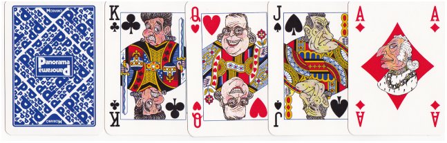 Description: Description: mazzo allegato alla rivista "Panorama"; assi e figure rappresentano caricature di personaggi politici italiani degli anni '90. I joker dei due mazzi (rosso e blu) sono diversi. Disegni di Giorgio Forattini. Deck distributed by the magazine "Panorama; aces and court cards depict caricatures of Italian political characters of the 90s. The jokers of the 2 decks (red or blue back) are different. Drawings by Giorgio Forattini (famous Italian satirical illustrator).