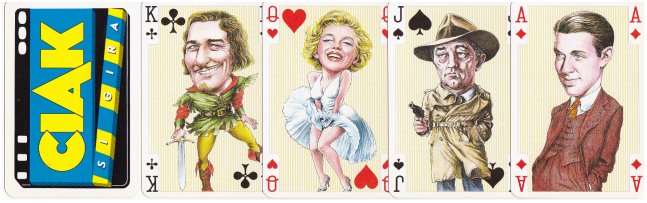 Description: Description: mazzo allegato alla rivista "Ciak", senza astuccio; assi e figure rappresentano caricature di attori. Disegni di Franco Bruna. Deck distributed by the magazine "Ciak", without box; aces and court cards depict caricatures of actors. Drawings by Franco Bruna.