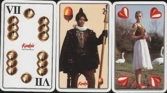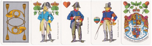 Description: Description: Le carte rappresentano stemmi (Assi), divise (figure), edifici e mezzi (altre carte) del 17°-19° secolo delle poste di Turn und Taxis (Ghiande), Sassonia (Foglie), Prussia (Cuori) e Meclemburgo (Campanelli). Didascalia a lato, in tedesco. Disegni di Volker Hartmann. The cards depict coat of arms (Aces), uniforms (court cards), buildings and transports (pips) of 17th-19th century, of the Posts of Turn und Taxis (Acorns), Saxony (Leaves), Prussia (Hearts) and Mecklemburg (Bells). Drawings by Volker Hartmann.