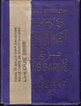 Description: The only thing of this deck that has survived is the box. Since there is a revenue on the box I cannot read everything that is written on the box itself. What can be read (plus my guess): ...RIC FINISH, ...ART'S ...CH WHIST, 96, ...NG CARDS, THE ...LIDATED CARD CO, ...LAND CITY, N.Y., ...E IN U.S.A (Fabric Finish, Hart's French Whist 96 Playing Cards, The Consolidated Card Co, ???land City, N.Y., Made in U.S.A.)